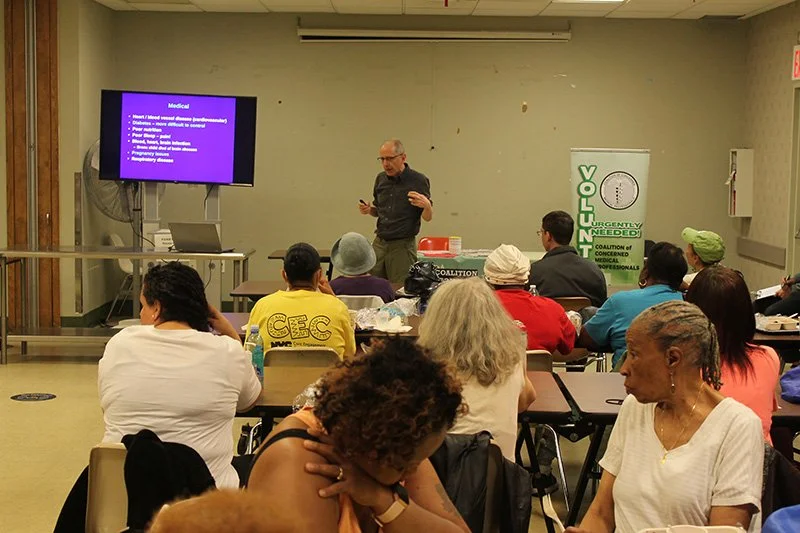 Health professional volunteers lead medical education and information sessions on topics of concern for CCMP benefit recipients.